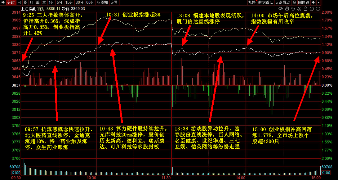 市场全天震荡反弹,三大指数集体上涨。算力硬件股集体爆发,德科立、光库科技等多股涨停。游戏等AI应用端活跃,巨人网络、欢瑞世纪等封板。抗流感概念表现活跃,海南海药、金迪克等涨停。福建本地股反弹,中国武夷、厦门信达等涨停。下跌方面,水产股集体调整,中水渔业、獐子岛跌停。个股涨多跌少,沪深京三市约4300股飘红,今日成交1.83万亿。