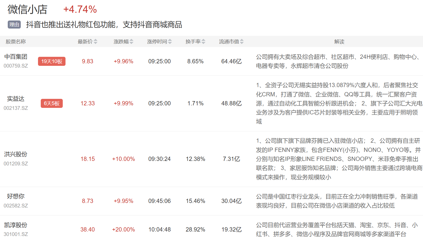 微信小店概念今日继续活跃,中百集团、实益达、好想你等多股涨停。