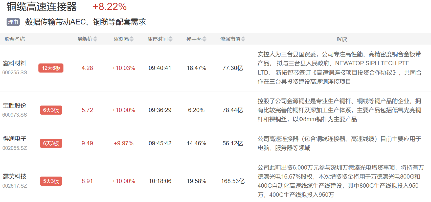 铜缆高速连接器概念今日继续大涨,鑫科材料、沃尔核材、博创科技等多股涨停。