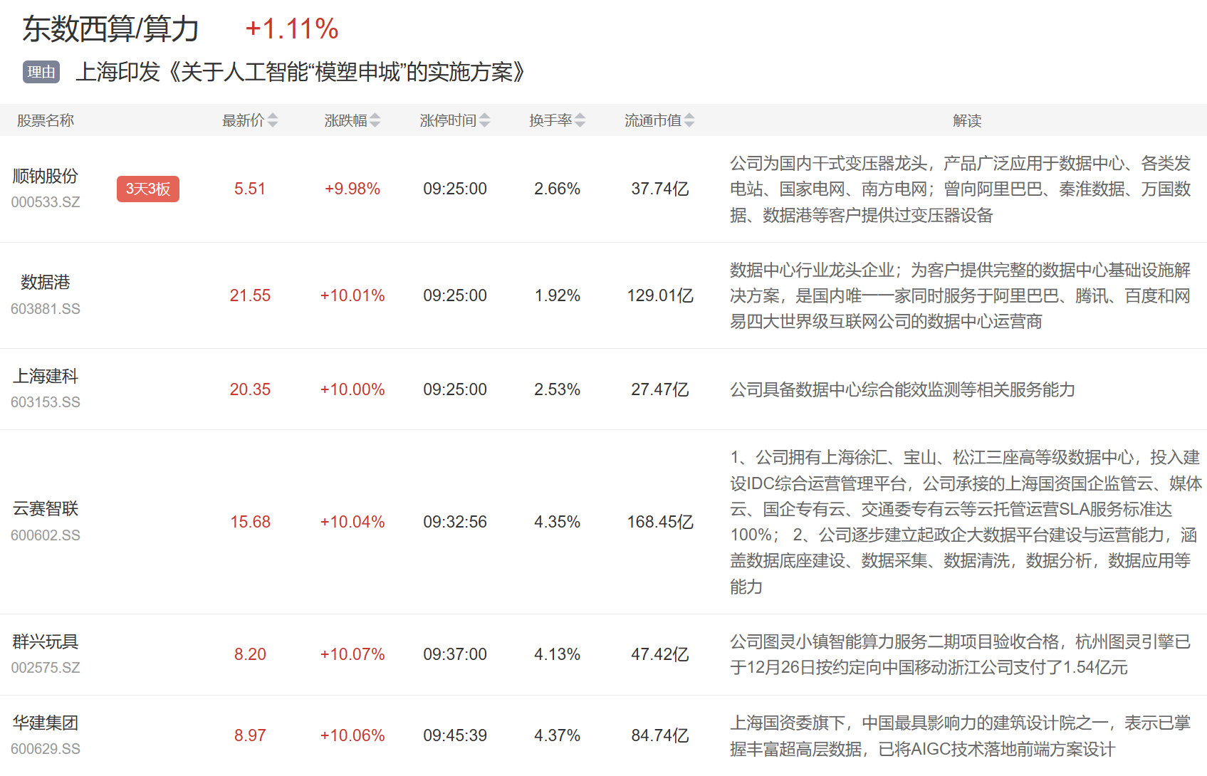 算力板块今日继续活跃,顺纳股份3连板,数据港、上海建科、云赛智联等多股涨停。