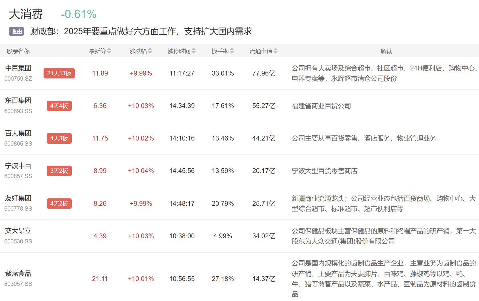 大消费板块今日也继续表现,中百集体、东百集团、百大集团等多股涨停。