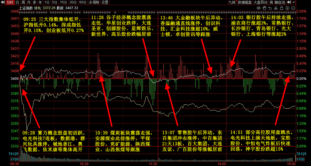 市场全天窄幅震荡,三大指数小幅上涨,黄白二线走势分化,微盘股指数跌近2%,北证50指数跌逾4%。银行、保险等金融股继续走强,香溢融通涨停,威士顿、汇金科技涨超10%,渝农商行、常熟银行、长沙银行等多股涨超2%。算力概念股继续活跃,中辰股份、安诺其、群兴玩具、云赛智联、数据港等多股涨停。下跌方面,部分高位股尾盘跳水,电光科技上演天地板,神宇股份跌超10%。个股跌多涨少,沪深京三市下跌个股超4000只,今日成交1.29万亿元。