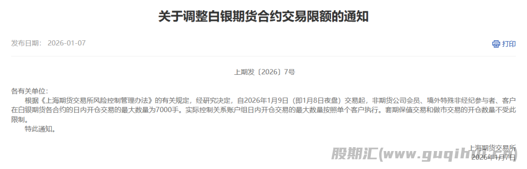 同日,上期所发布关于调整白银期货合约交易限额的通知。根据《上海期货交易所风险控制管理办法》的有关规定,经研究决定,自2026年1月9日(即1月8日夜盘)交易起,非期货公司会员、境外特殊非经纪参与者、客户在白银期货各合约的日内开仓交易的最大数量为7000手。实际控制关系账户组日内开仓交易的最大数量按照单个客户执行。套期保值交易和做市交易的开仓数量不受此限制。