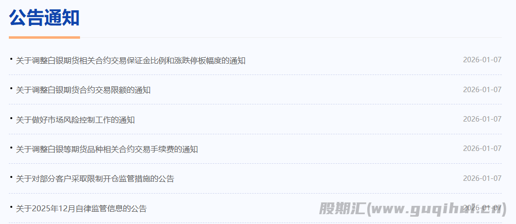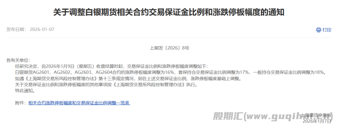 自2026年1月9日(星期五)收盘结算时起,交易保证金比例和涨跌停板幅度调整如下:白银期货AG2601、AG2602、AG2603、AG2604合约的涨跌停板幅度调整为16%,套保持仓交易保证金比例调整为17%,一般持仓交易保证金比例调整为18%。