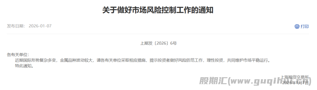 公告称,近期国际形势复杂多变,金属品种波动较大,请各有关单位采取相应措施,提示投资者做好风险防范工作,理性投资,共同维护市场平稳运行。