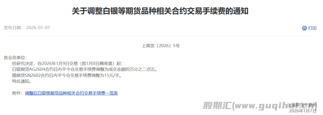 此外,上期所发布调整白银等期货品种相关合约交易手续费的通知。自2026年1月9日交易(即1月8日晚夜盘)起,白银期货AG2604合约日内平今仓交易手续费调整为成交金额的万分之二点五,锡期货SN2602合约日内平今仓交易手续费调整为15元/手。
