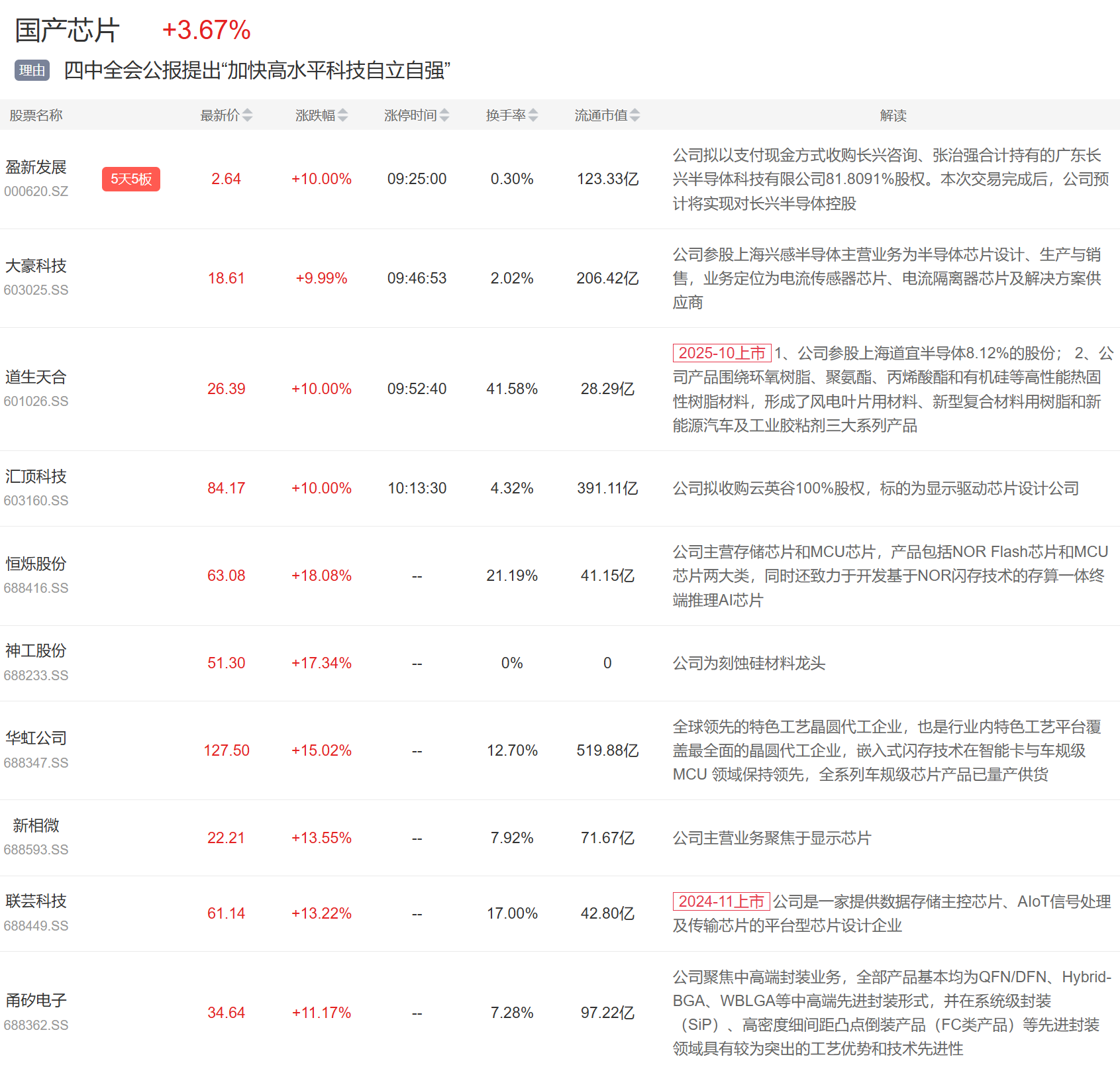 国产芯片概念今日反弹,盈新发展5连板,大豪科技、汇顶科技等涨停,寒武纪大涨9%。