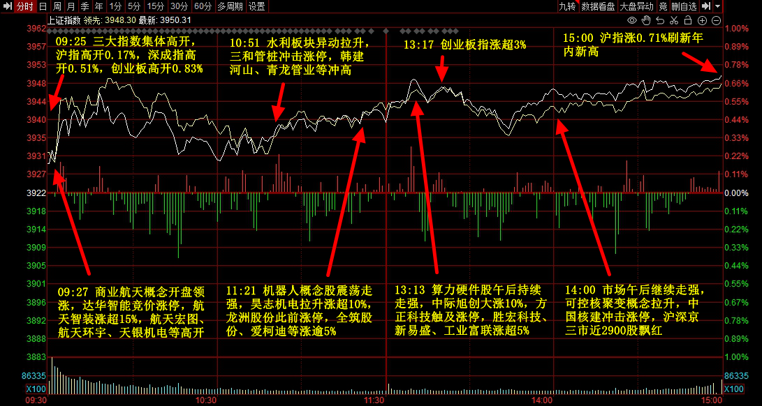 市场全天震荡走强,沪指刷新年内新高,创业板指涨超3%。存储芯片板块大涨,普冉股份、香农芯创等多股涨停。CPO、PCB等算力硬件股拉升,生益电子等涨停,中际旭创涨超10%创新高。商业航天概念强势,中国卫星、上海沪工等涨停。下跌方面,煤炭、燃气板块调整,百川能源、云煤能源、安泰集团跌停。个股涨多跌少,沪深京三市超3000股飘红,今日成交近2万亿,较上日放量超3000亿。