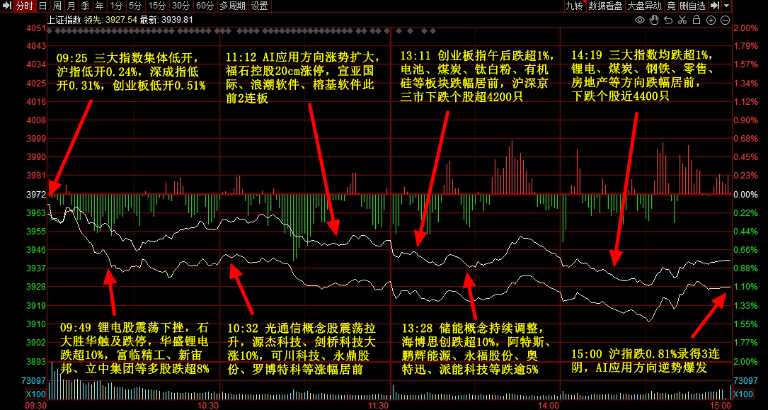 市场全天低开低走,三大指数午后均跌超1%。AI应用方向逆势大涨,宣亚国际、光云科技等多股涨停。半导体芯片股冲高回落,龙迅股份、大为股份涨停。下跌方面,煤炭板块走低,云煤能源跌停;电池板块下挫,天际股份等跌停。个股跌多涨少,沪深京三市超4100股飘绿,今日成交1.94万亿。