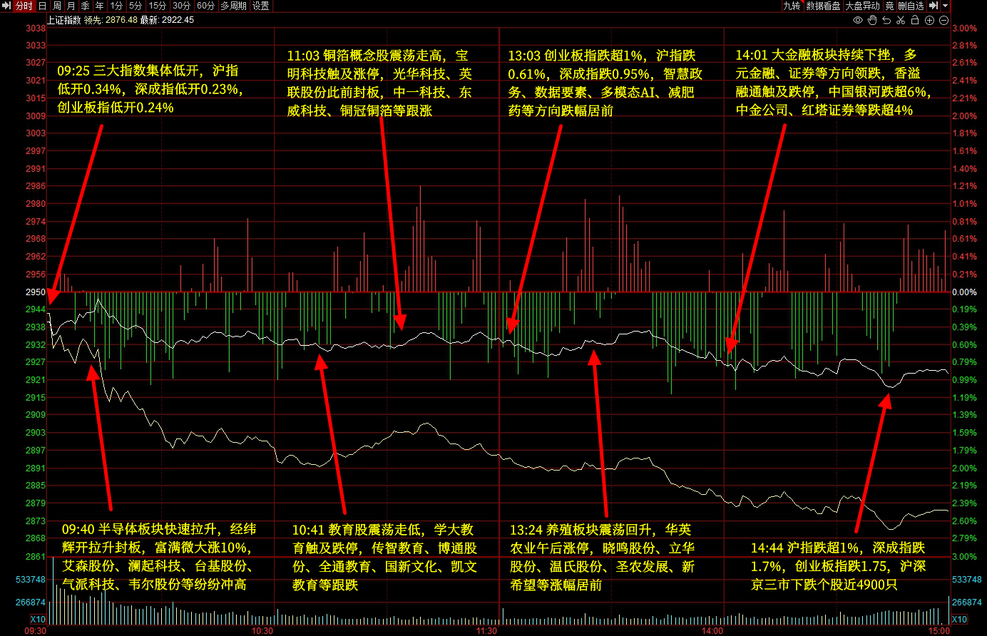 截至收盘,沪指、深成指、创业板指分别收跌0.93%、1.54%、1.62%,市场超4800股下跌,400余股上涨。