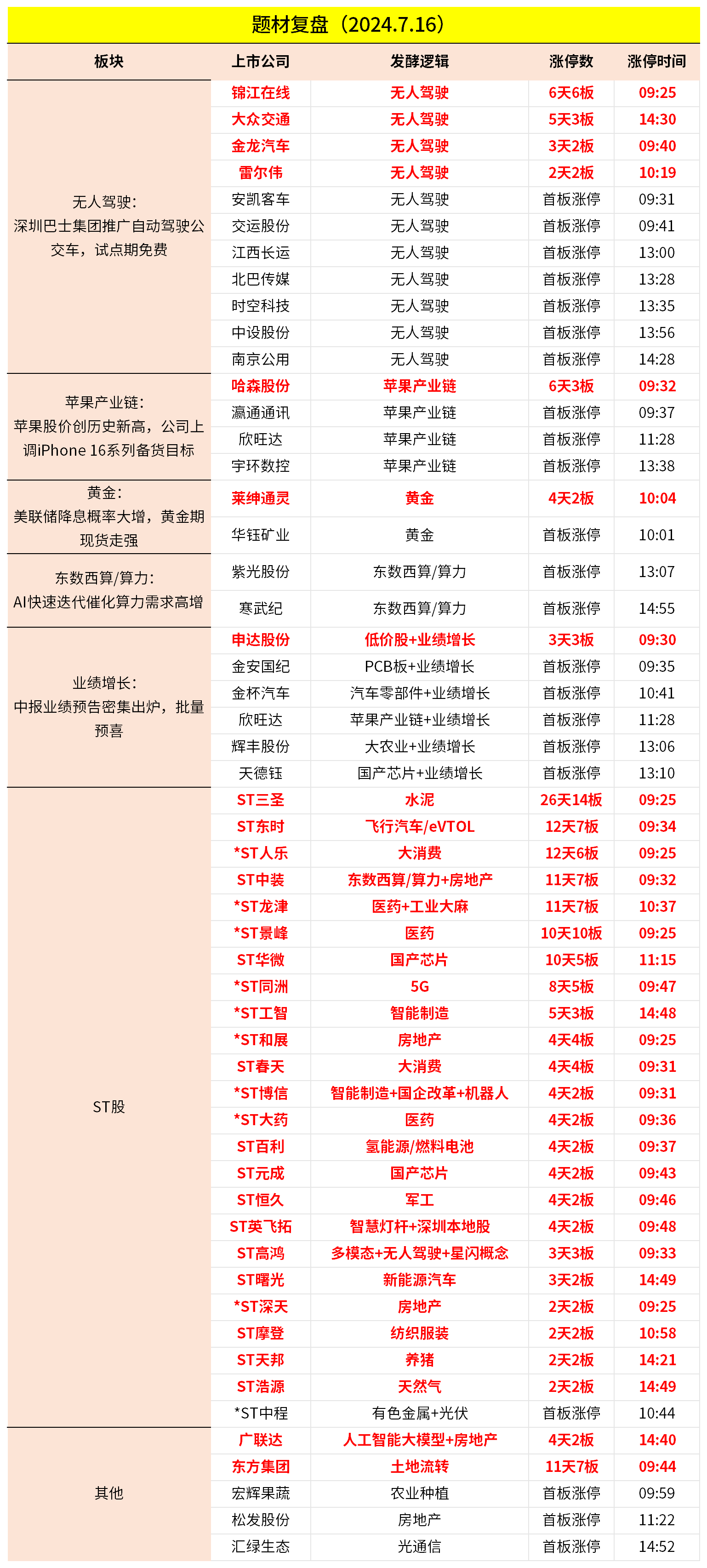 2024-07-16主题复盘 | 无人驾驶催化不断,苹果产业链黄金保持活跃