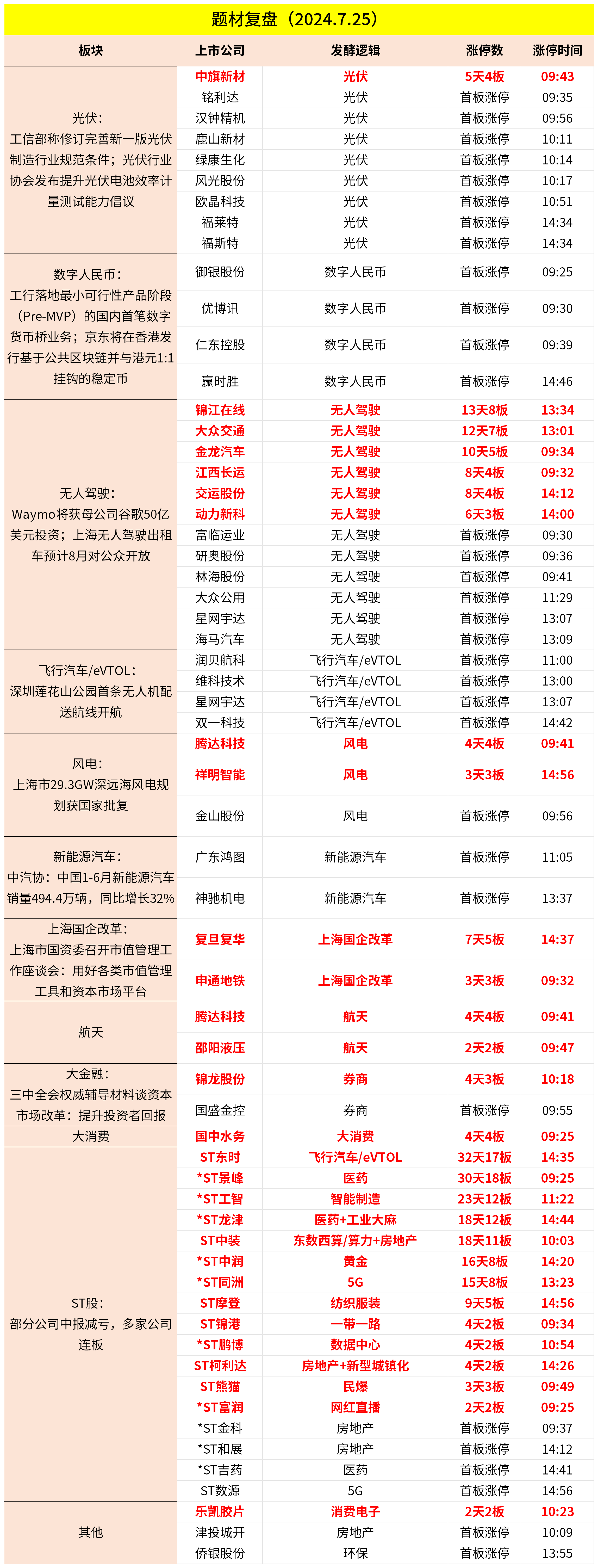 2024-07-25主题复盘 | 光伏新能源大涨,数字人民币异动,无人驾驶高潮迭起