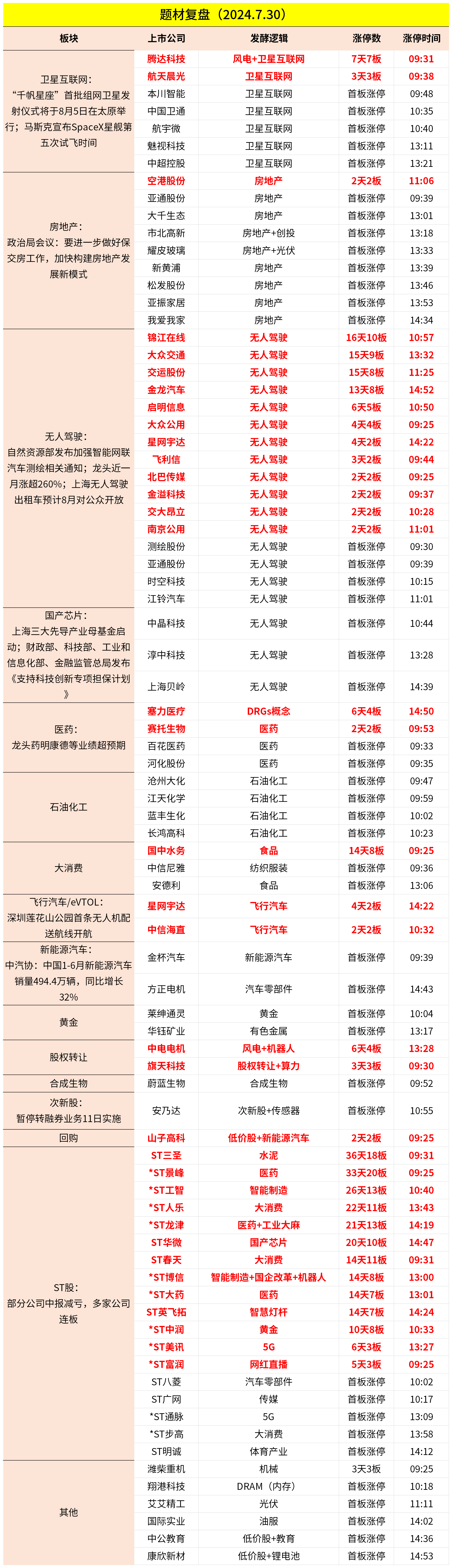 2024-07-30主题复盘 | 卫星互联网、无人驾驶-持续,房地产板块异动