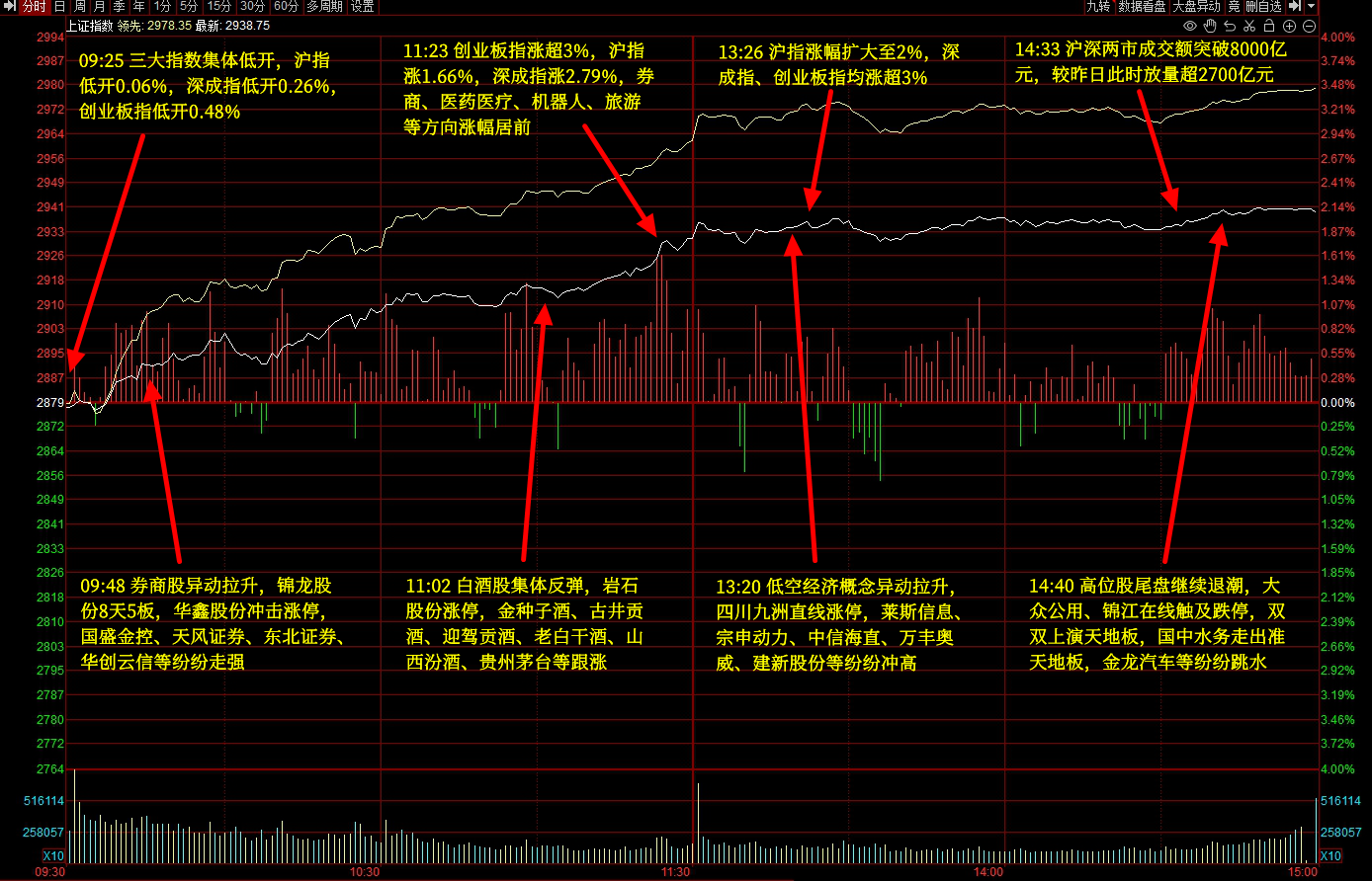 三大指数今日低开高走,沪指午后放量涨超2%,深成指、创业板指均涨逾3%。以券商为首的大金融板块爆发,锦龙股份8天5板,天风证券、首创证券、华鑫股份、国盛金控、太平洋、弘业期货等十余股涨停。医药医疗股全线反弹,香雪制药、通策医疗、昭衍新药、金域医学、百花医药等多股封板。机器人概念股集体走强,信邦智能、中大力德、柯力传感、鸣志电器、雷赛智能、龙洲股份等涨停。下跌方面,高位股出现退潮,大众公用、锦江在线尾盘触及跌停,双双上演天地板,国中水务走出准天地板,金龙汽车、申通地铁等跌超7%。个股呈现普涨态势,沪深京三市超5100股飘红,今日成交达9033亿元,较上个交易日放量3038亿。