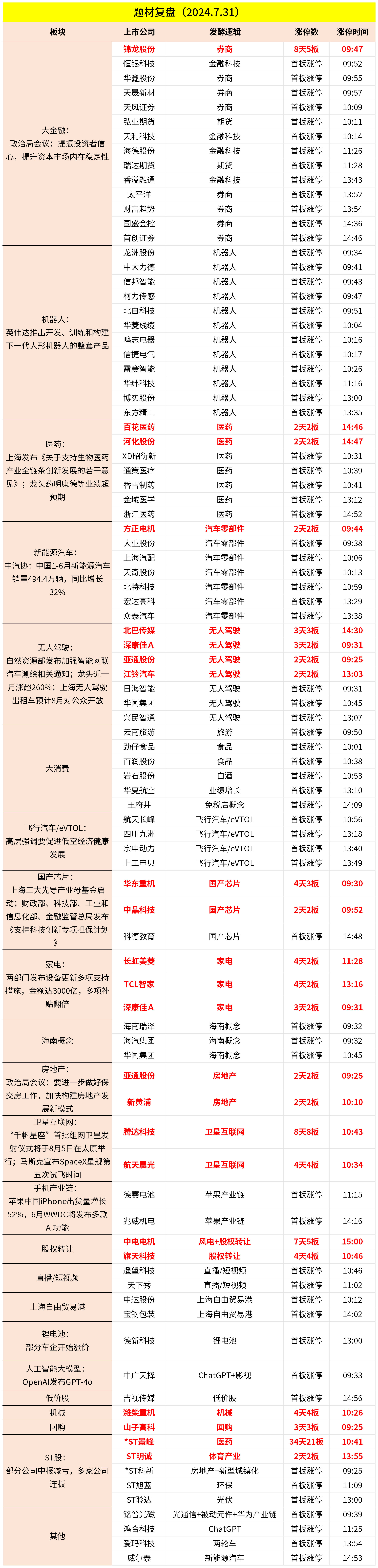 2024-07-31主题复盘 | 指数长阳大幅放量,大金融、机器人、医药等涨幅居前