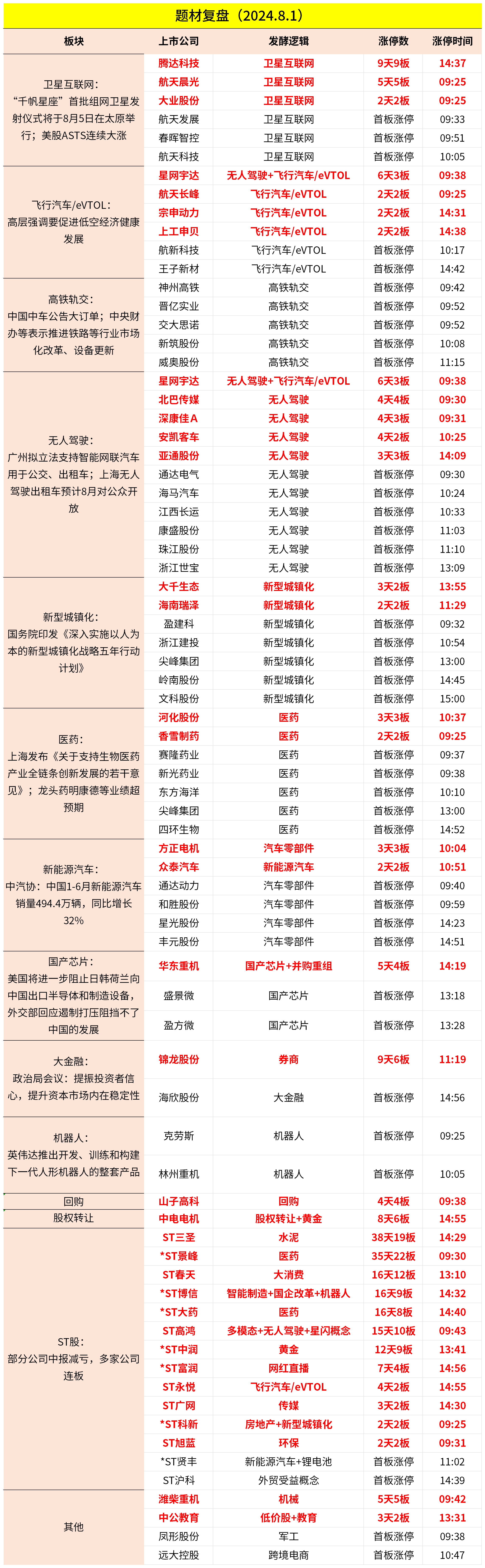 2024-08-01主题复盘 | 高铁轨交开盘大涨,卫星互联网飞行汽车继续走强