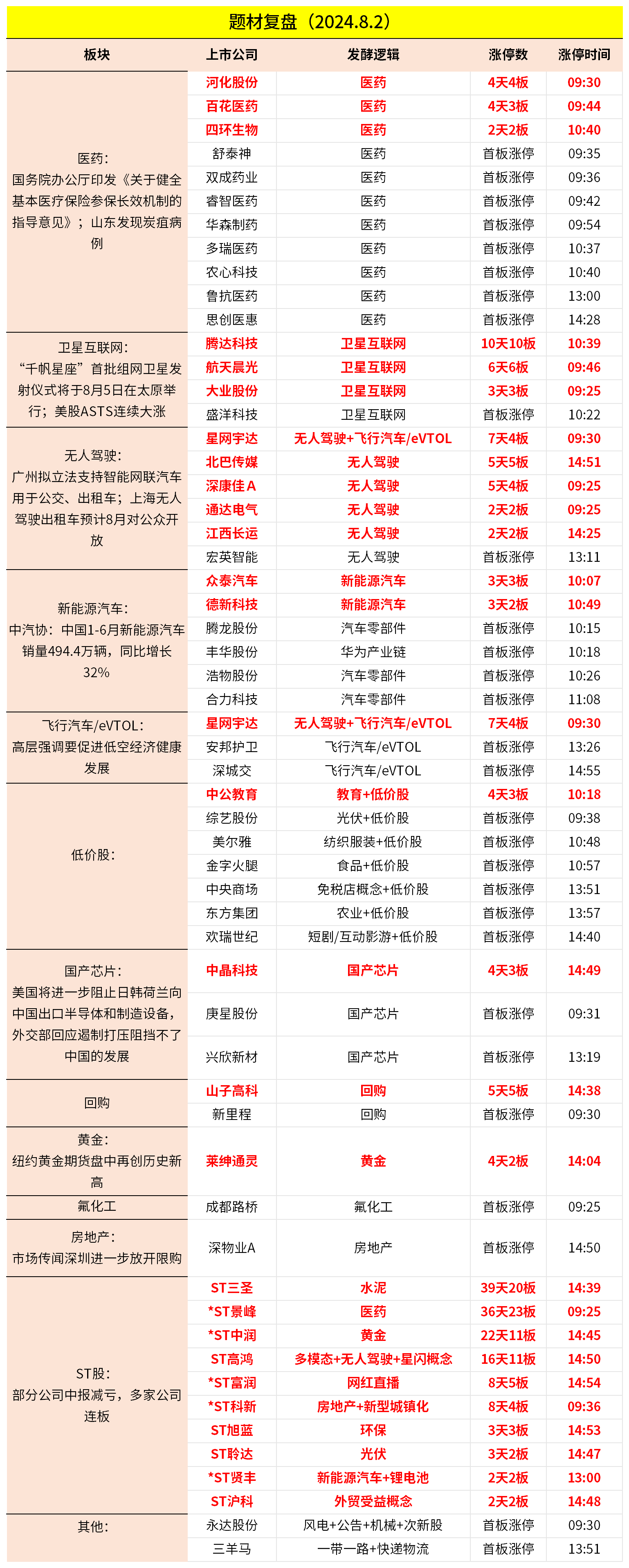 2024-08-02主题复盘 | 医药板块全线大涨,卫星高标继续拓空间,飞行汽车午后再度活跃