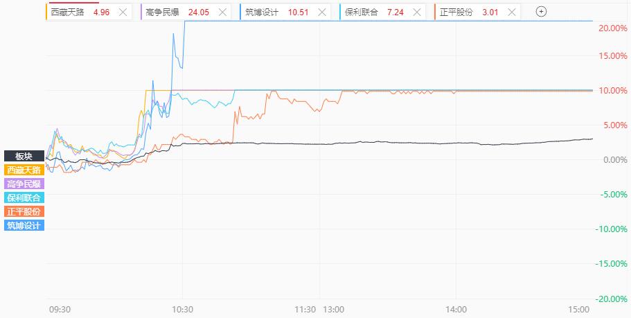 民爆、西藏、基建板块等携手走强,西藏天路、博筑设计(20CM)、正平股份、法兰泰克、中岩大地、高争民爆、保利联合等集体涨停;