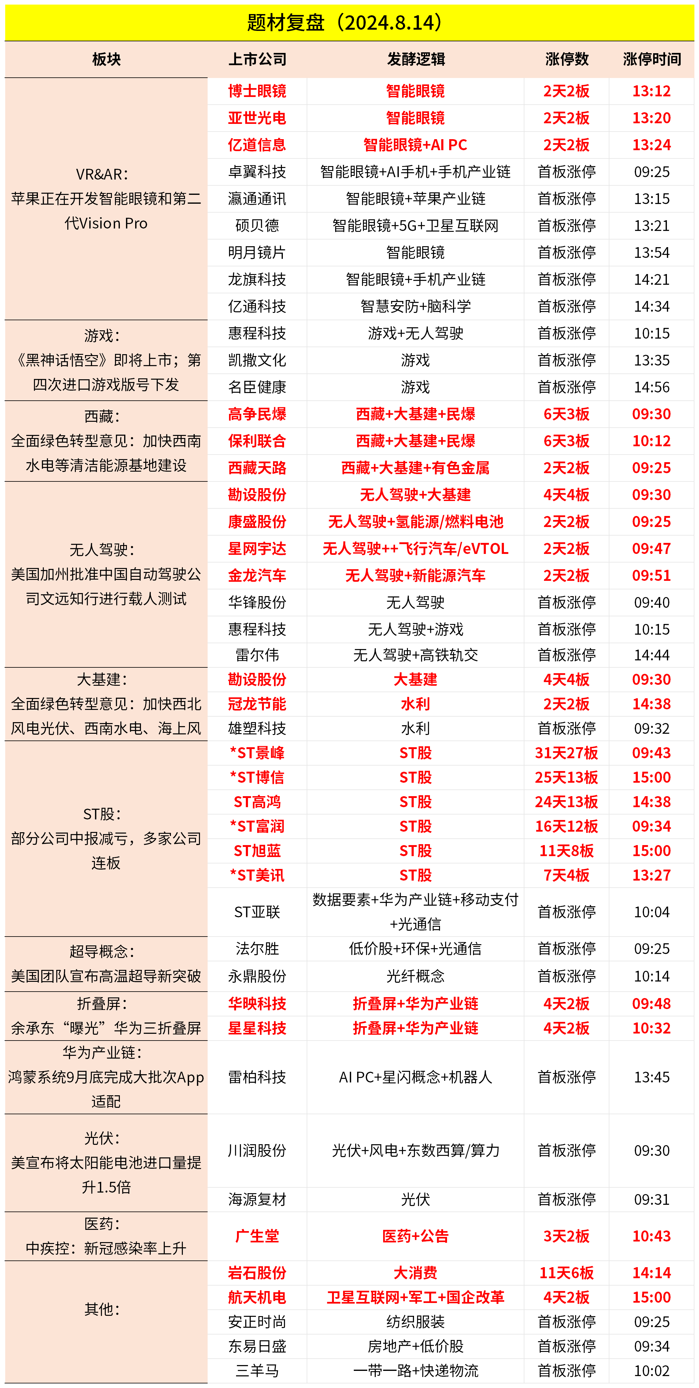 2024-08-14主题复盘 | AR、大基建、无人驾驶延续赚钱效应,游戏、超导显现异动