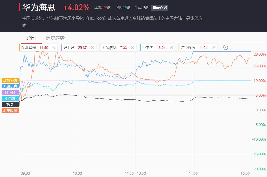 海思概念继续走强,世纪鼎利(20CM炸)、深圳华强3连板,力源信息(20CM)、汇中股份(20CM炸)、好上好2连板,中电港、四川长虹涨停;