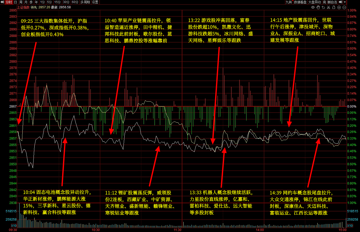 沪指今日弱势震荡,深成指、创业板指冲高回落。固态电池概念股集体走强,鹏辉能源、三祥新材、华正新材涨停,翔丰华、当升科技涨超10%。苹果产业链拉升,田中精机、领益智造、哈森股份封板。华为海思概念延续强势,深圳华强5连板,好上好、慧博云通涨停。机器人概念股继续活跃,力星股份、襄阳轴承、爱仕达、远大智能等多股涨停。下跌方面,游戏股冲高回落,富春股份跌超10%;医药医疗股继续调整,广生堂、艾力斯、兰卫医学、凯普生物跌超10%。个股跌多涨少,沪深京三市超3200股飘绿,今日成交5095亿元。