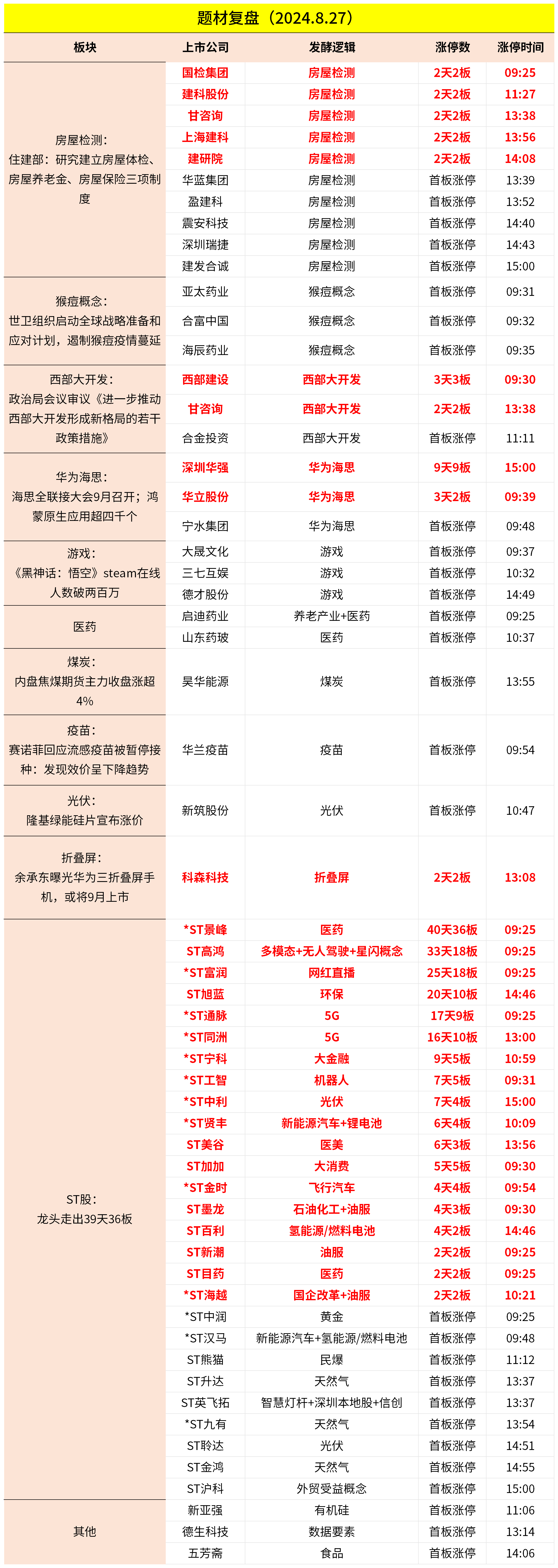 2024-08-27主题复盘 | 房屋检测大涨,猴痘概念卷土重来,ST板块掀涨停潮