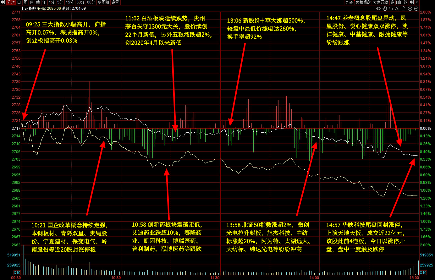 沪指今日探底回升,2700点失而复得,黄白二线有所分化,微盘股指数跌超1.5%。光刻机(胶)概念股开盘大涨,同飞股份、波长光电、海立股份、张江高科等多股涨停。大金融板块午后拉升,弘业期货、九鼎投资封板。房地产震荡反弹,中交地产、电子城涨停。国企改革概念继续活跃,大唐电信、龙高股份、云内动力等封板。下跌方面,医药医疗股走低,英科医疗、海南海药跌停;折叠屏概念下挫,大富科技跌逾14%。个股跌多涨少,沪深京三市超3600股飘绿,今日成交4793亿元。