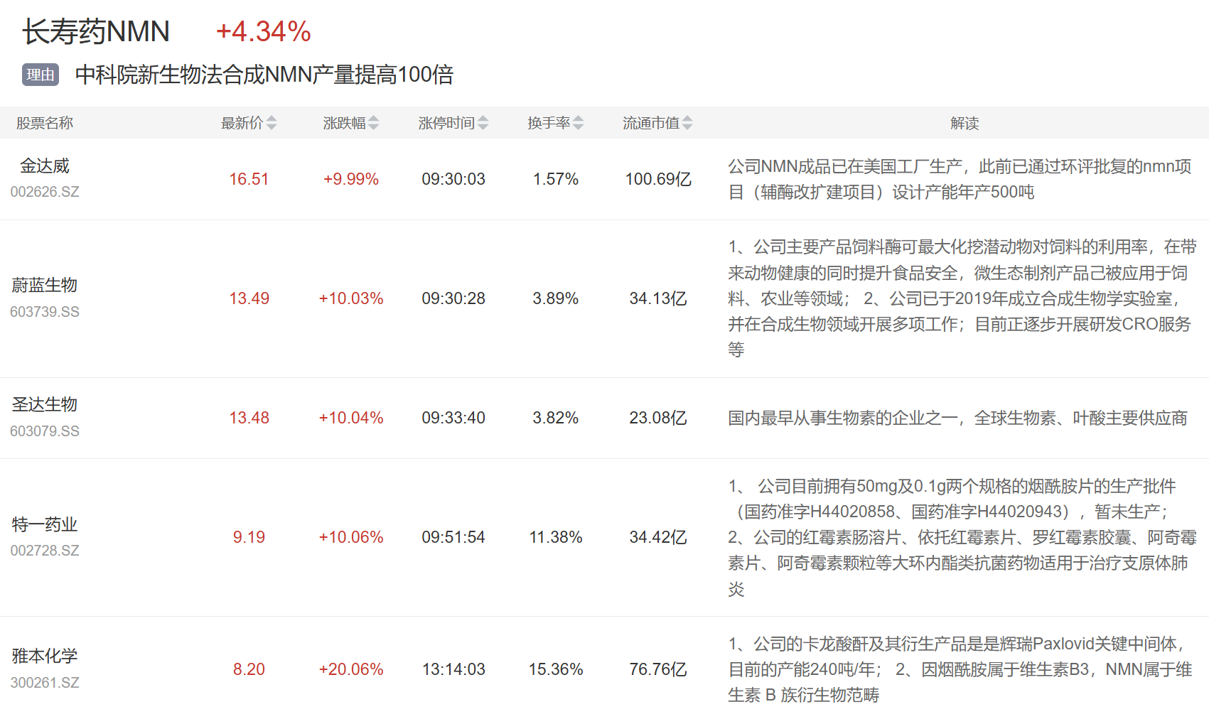 长寿药NMN概念今日异动,金达威、蔚蓝生物、圣达生物等多股涨停。