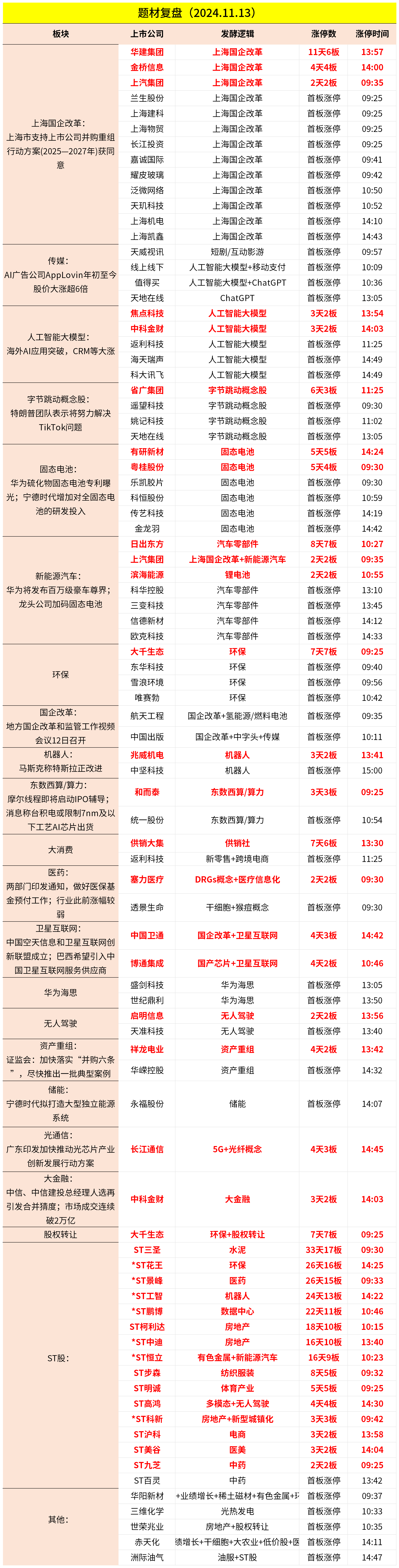 2024-11-13复盘:上海国企改革迎政策催化,AI应用再度爆发,固态电池活跃