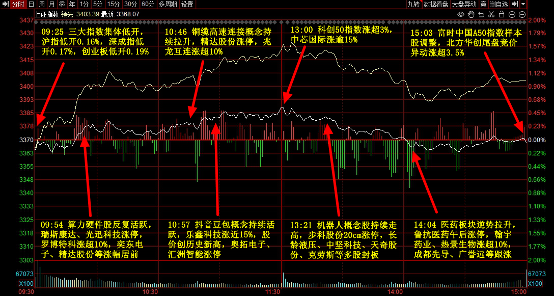 市场全天冲高回落,三大指数小幅下跌,黄白二线分化明显,题材概念表现活跃。半导体芯片股集体爆发,灿芯股份、锴威特、盈方微、瑞芯微、上海贝岭等多股涨停,中芯国际涨超10%,寒武纪再创历史新高。算力硬件股继续走强,精达股份、露笑科技、瑞斯康达、光迅科技等涨停。AI眼镜概念反复活跃,天键股份、华灿光电、亿道信息、国星光电等封板。食品等消费股反弹,交大昂立、皇氏集团、紫燕食品、来伊份等涨停。个股涨多跌少,沪深京三市超3500股飘红,今日成交1.53万亿。