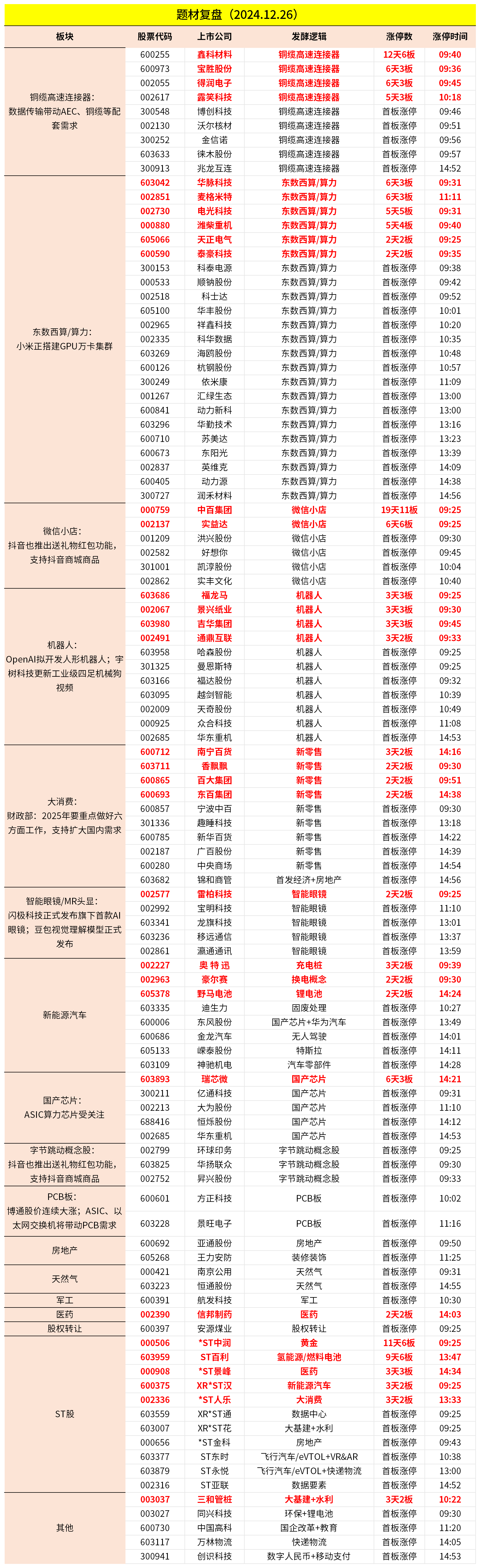 2024-12-26复盘:深成指、创业板指走势偏强 铜缆高速连接器掀涨停潮,算力新零售活跃