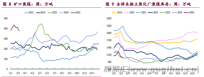 库存方面,截至 2 月 7 日,独立焦化厂焦炭总库存 156.66 万吨,周环比增 13.36 万吨,同比偏高 58.3 万吨;钢厂焦化厂焦炭库存 690.96 万吨,周环比降 9.78 万吨,同比偏高 4.31 万吨,产业链焦炭总库存略高于去年同期,尤其是下游原材料可用天数充足,使得现货市场氛围依然偏淡。